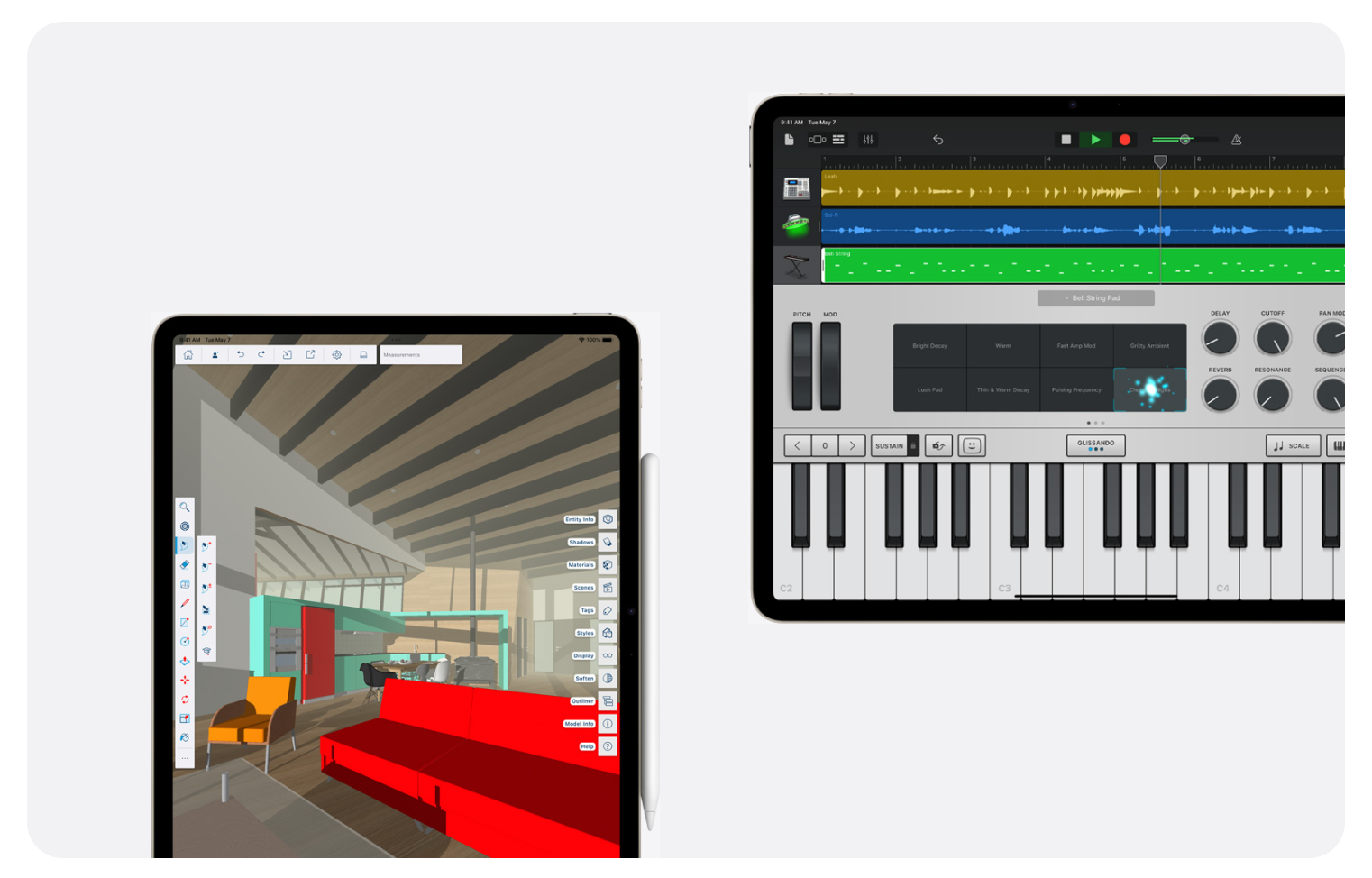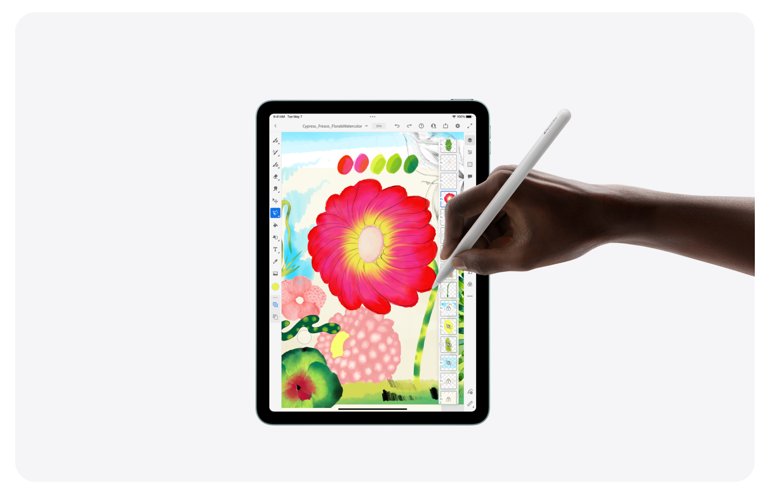 Что касается производительности, то в iPad Air 2024 года установлен чип M2 — тот самый, который ранее использовался только в MacBook и настольных компьютерах Apple. Это значит, что теперь iPad Air стал в разы мощнее и быстрее. При этом такие потрясающие характеристики не идут в ущерб автономности устройства: гаджет может работать до 10 часов при работе по Wi-Fi или просмотре видео. В планшете 8-ядерный CPU (4 производительных и 4 эффективных ядра), 10-ядерный GPU и 16-ядерный Neural Engine, подкрепленный 8 ГБ оперативной памяти. Минимальная конфигурация памяти начинается со 128 ГБ, а в топовой комплектации может достигать 1 ТБ — это очень и очень хорошо! Что немного странно, так это обычный Liquid Retina дисплей, что и раньше. Он рассчитан на 500 нит яркости. Да, это не так много, но вполне достаточно для повседневного использования. В остальном же у новинки хорошее обновление «начинки» на долгие годы вперёд: планшет точно будет радовать вас долгое время.